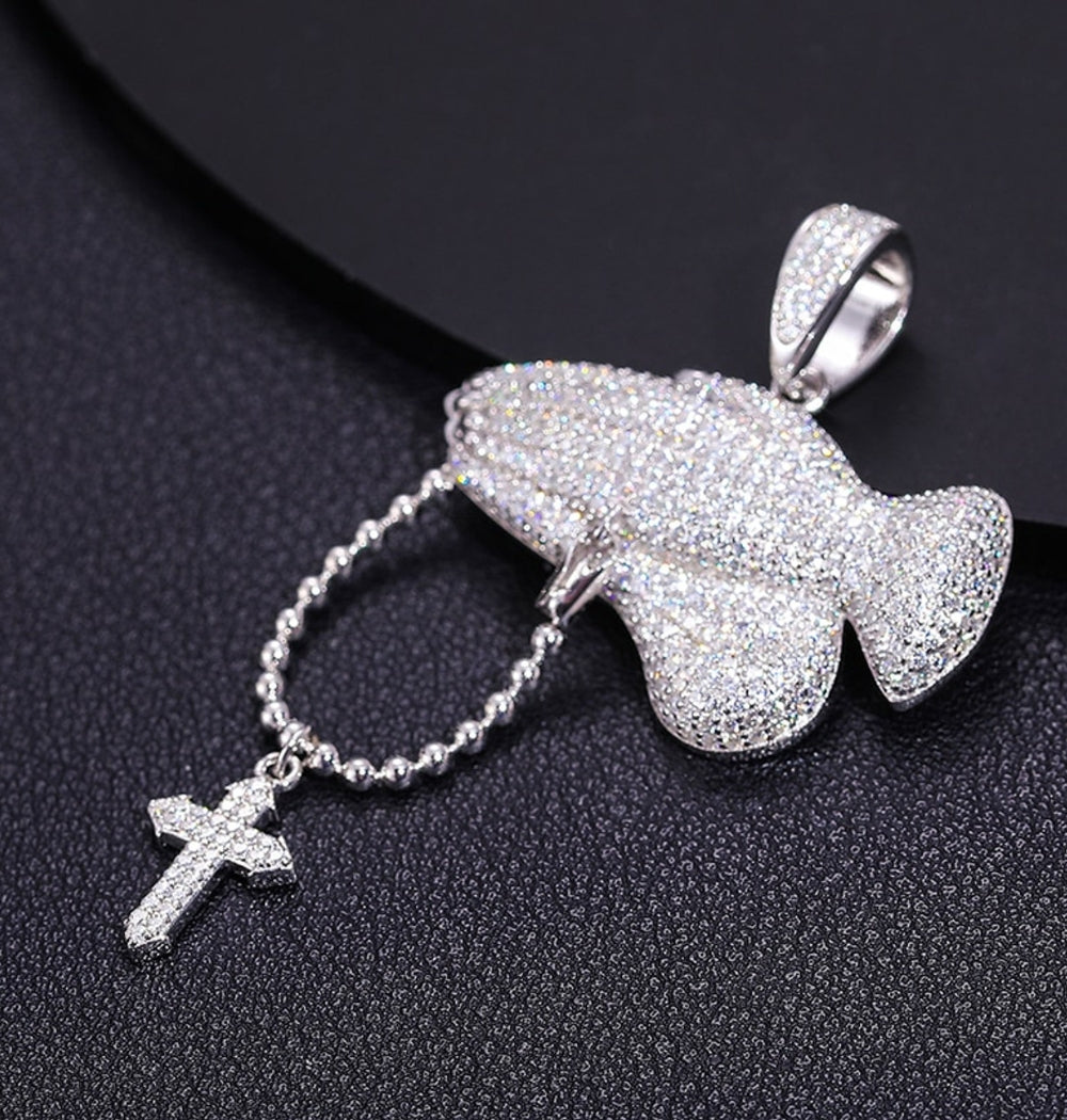 Moissanite Iced Out Praying Hands With Cross Pendant
